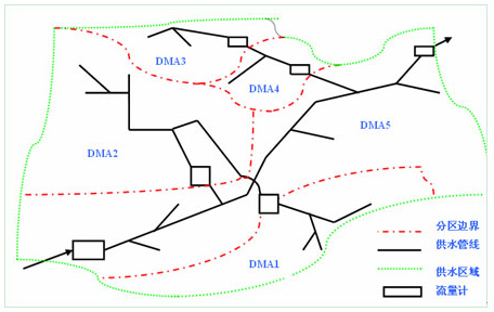 DMA分區管理是指在供水系統中建一個個被切割分離的獨立區域,通常采取關閉閥門或安裝流量儀表來形成虛擬或實際獨立區域。通過對進入或流出這一區域的水量進行計量,并對流量進行分析后來定量水的泄漏,便于檢漏人員準確的決定在何時何處檢漏,并進行主動的防泄漏控制。